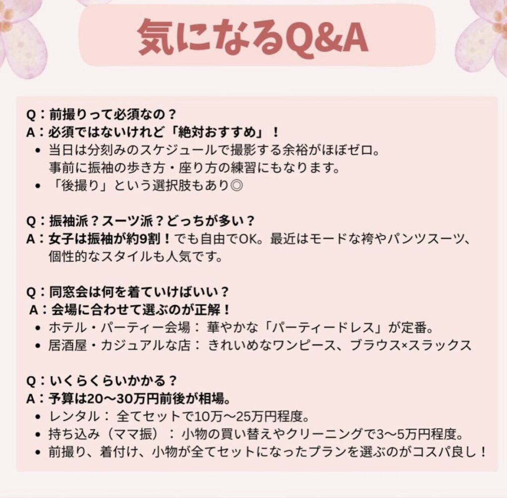 💡 編集部メモ 成人式の予算は20〜30万円前後が相場です。 レンタルは全てセットで10〜25万円程度、持ち込み(ママ振)なら小物の買い替え等で3〜5万円程度に抑えられます。 前撮り、着付け、小物が全てセットになったプランを選ぶのが最もコスパが良いですよ!