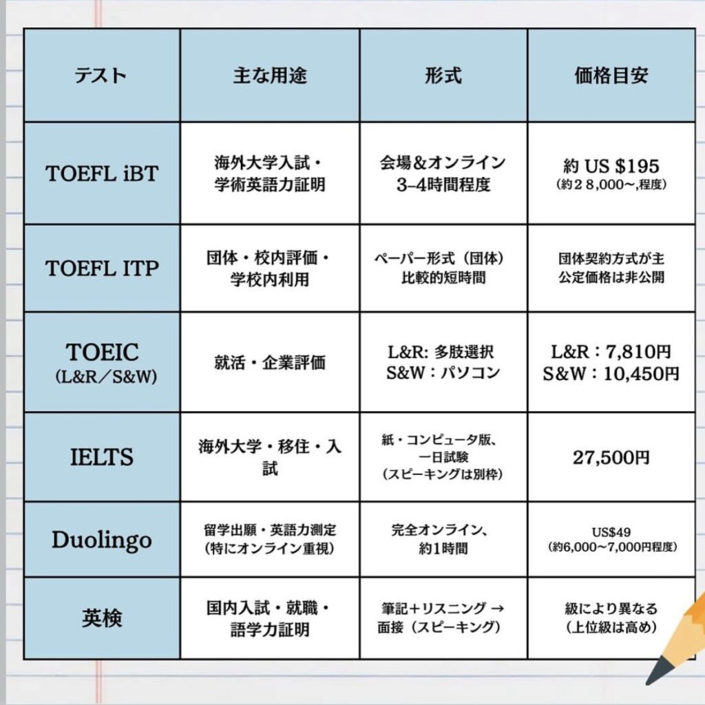 - Duolingo English Test: 自宅で受験可能な次世代テスト。安価で結果も早く、採用大学が拡大中です。