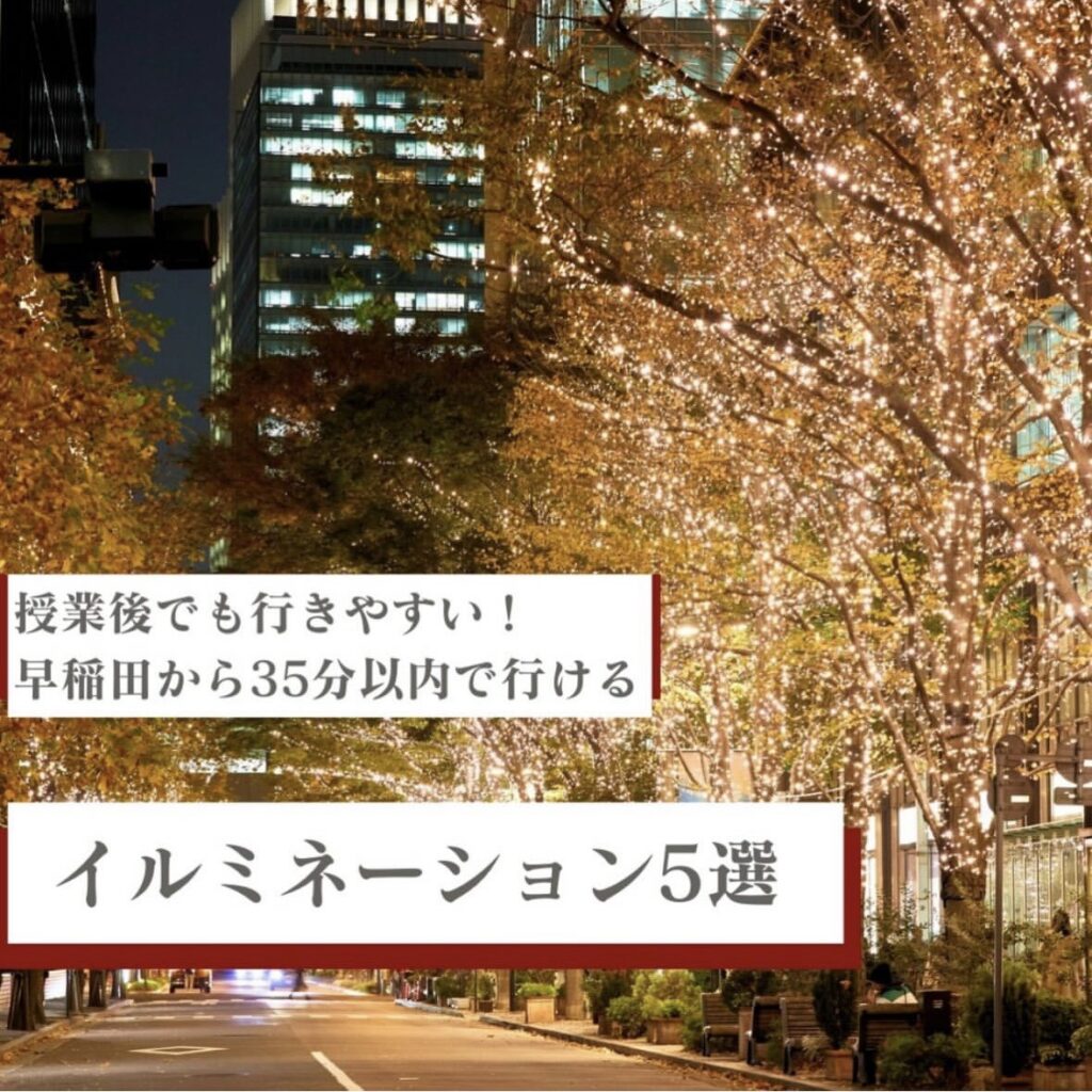 あけましておめでとうございます!早稲田情報局編集部です。2026年1月に入り、いよいよ秋学期の期末テストやレポート提出が近づいてきましたね。「勉強ばかりで息が詰まる…」「冬らしい思い出を作りたいけれど遠出する時間はない…」そんな悩みを抱える早大生も多いはず。今回は、早稲田から電車でたった35分以内で行ける、授業後にぴったりなイルミネーションスポットを5つご紹介します。