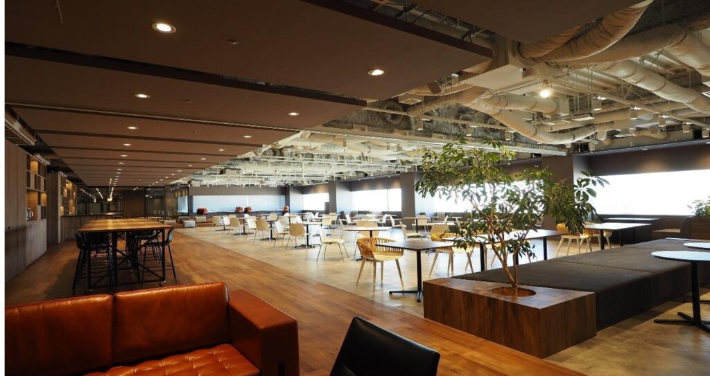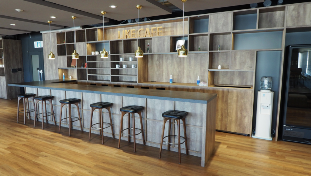 (↑ライクカフェと呼ばれる、入社式・研修・社員懇親会等の会場にもなるオープンスペースです。とても開放感があり、作業にも向いていそうでした。)